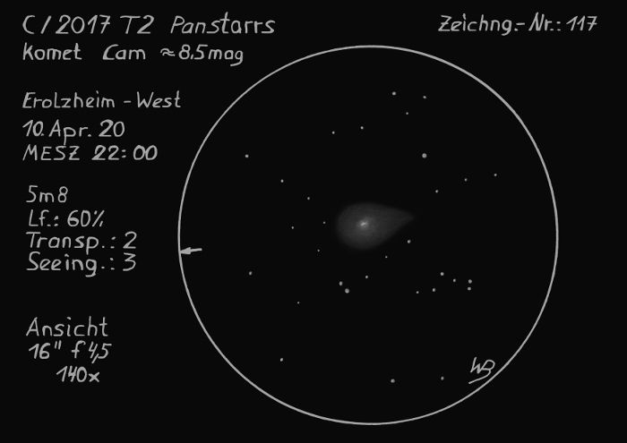 Sehr leicht im Übersichtsokular zu finden. Viel heller und größer als ATLAS nebenan. Heller Kern mit Koma und Schweifansatz. Die Schweifrichtung ist schwer zu fassen und wegen den nahen kleinen Sternen auch schwer zu bestimmen.